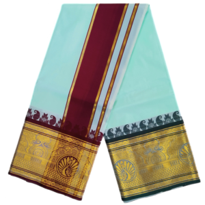 - Material: Soft Silk Karishma Color: Sea Green Size: 9×5 (4 Meter Dhoti + 2.25 Meter Angavastram) Border size: 6 Inch Note: Choose your item based upon the colour of the dhoti not by Border Design. The border Designs are subject to availability.