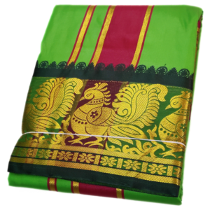 - Material: Soft Silk Karishma Color: Peacock Green Size: 9×5 (4 Meter Dhoti + 2.25 Meter Angavastram) Border size: 7 Inch